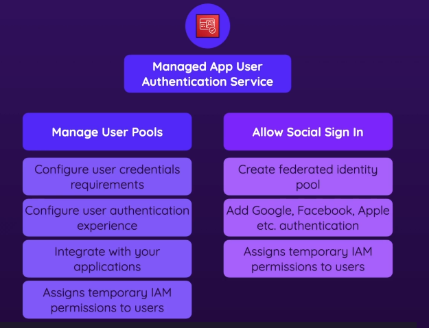 • Assigns temporary IAM permissions to users (ex. so that users can upload a file to a S3 bucket if that’s what ur app is doing)