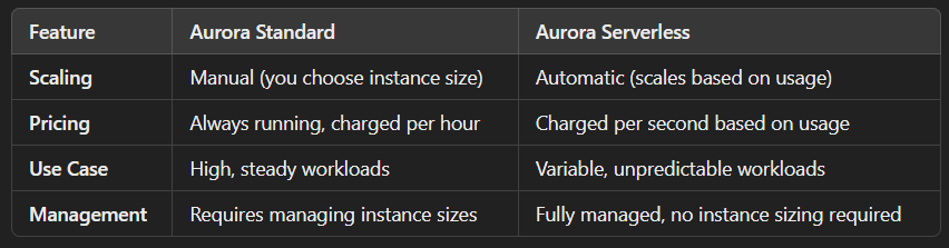 - Aurora Serverless: Pay-as-you-go, billed per second based on usage