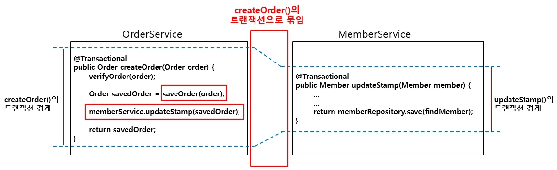 memberService.updateStamp(), all operations in both classes will be rolled back since they are within the same transaction boundary - In the diagram you can see that the individual transaction boundaries are now connected into one