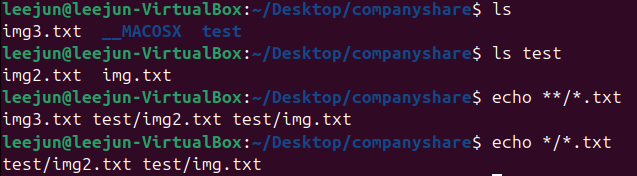echo **→ current files + directories + and all subdirectories & filesecho **/*→ current files + subdirectory & filesecho */**→ subdirectory + files (and not current files)