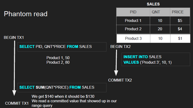 - Not a dirty read because we have read a committed value, and not a non-repeatable read the product didn’t really exist to begin with