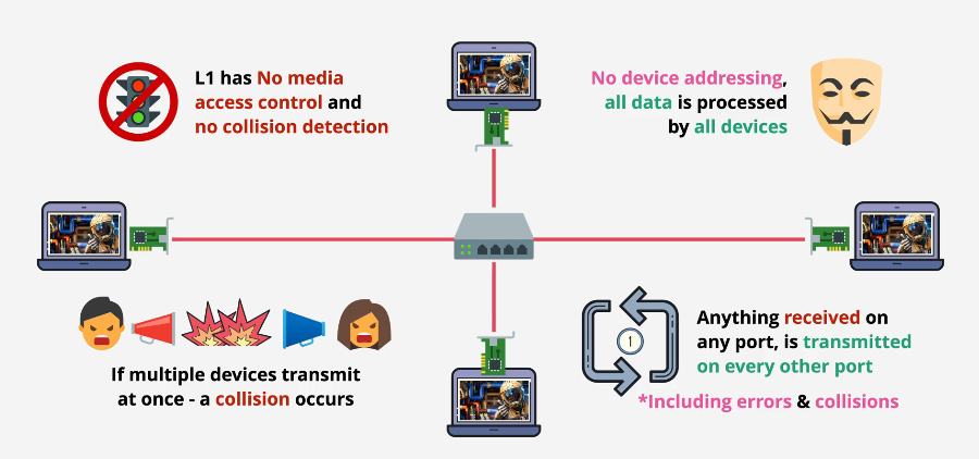 - simply transmits any data it receives onto the physical medium