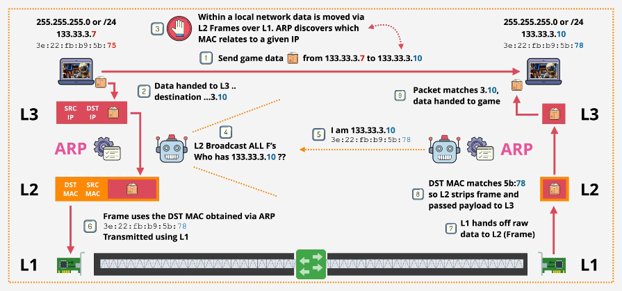 - When a device wants to send a packet to another IP on the same local network, it needs to encapsulate the packet in a frame