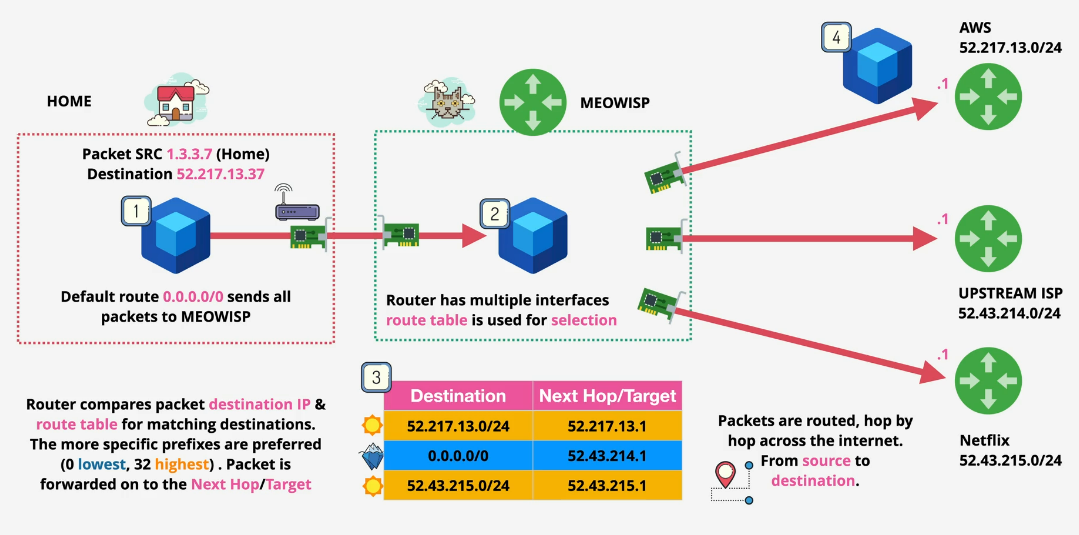 /x→ first x bits are for the network/0is the least specific (matches everything — “default route”)/32is the most specific (matches only one IP)