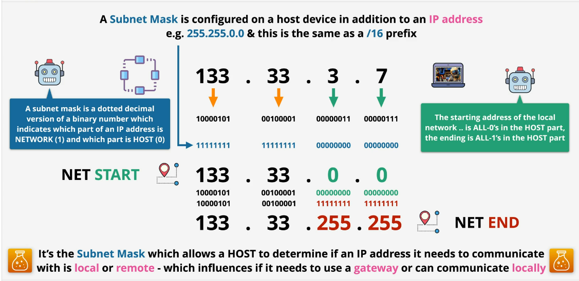 - Devices use subnet masks to check if a destination is on the same network or if it must forward to a gateway