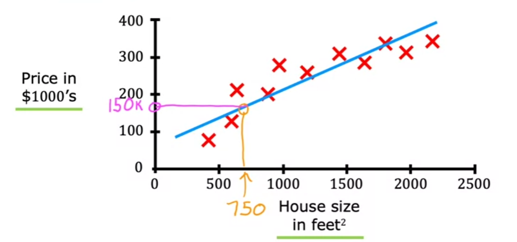 • This algorithm fits a straight line. When your friends ask you the price for house size 750 ft^2, the algorithm gives you 150k.