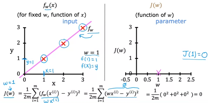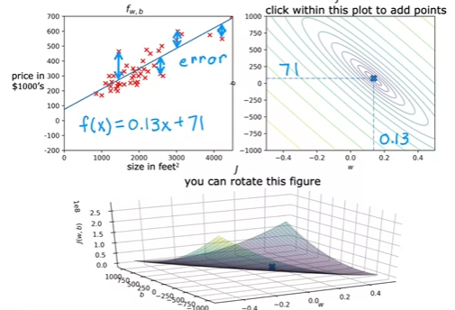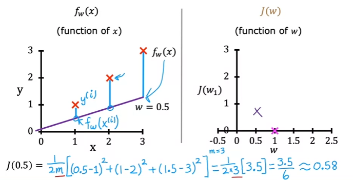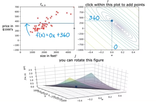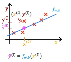 • Squared error cost function &=\frac{1}{2m}\sum_{i=1}^{m}(f_{w,b}(x^{(i)})-y^{(i)})^2 & \text{since } \hat{y}^{(i)}=f_{w,b}(x^{(i)}) \end{align}$$ - $m$ = the number of training examples - $\frac{1}{m}$ to get the *average* squared error - $\frac{1}{2m}$ for convention in ml - the most commonly used cost function for linear regression