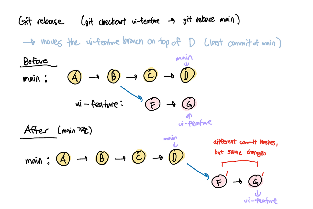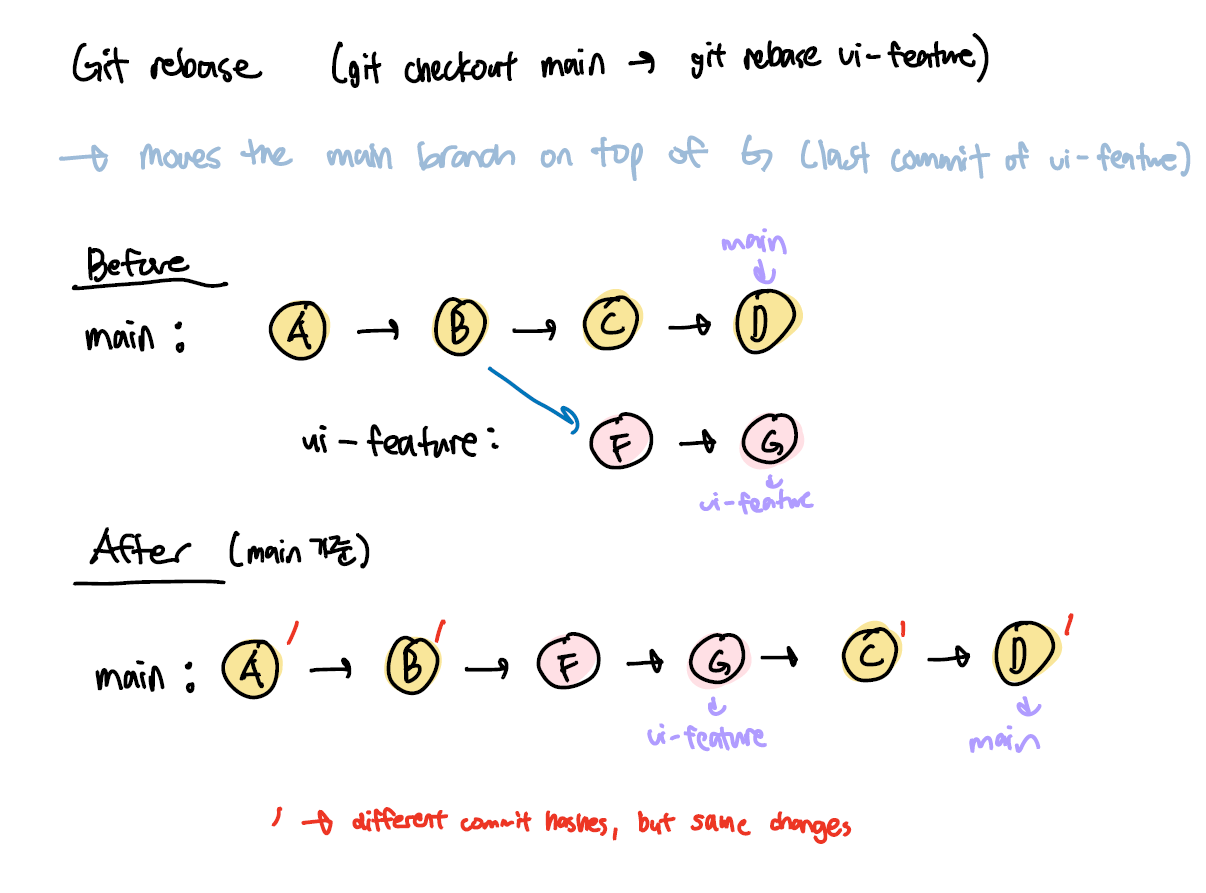 - Linearizes history. git rebase integrates changes by moving or combining a sequence of commits to a new base commit. It rewrites commit history.