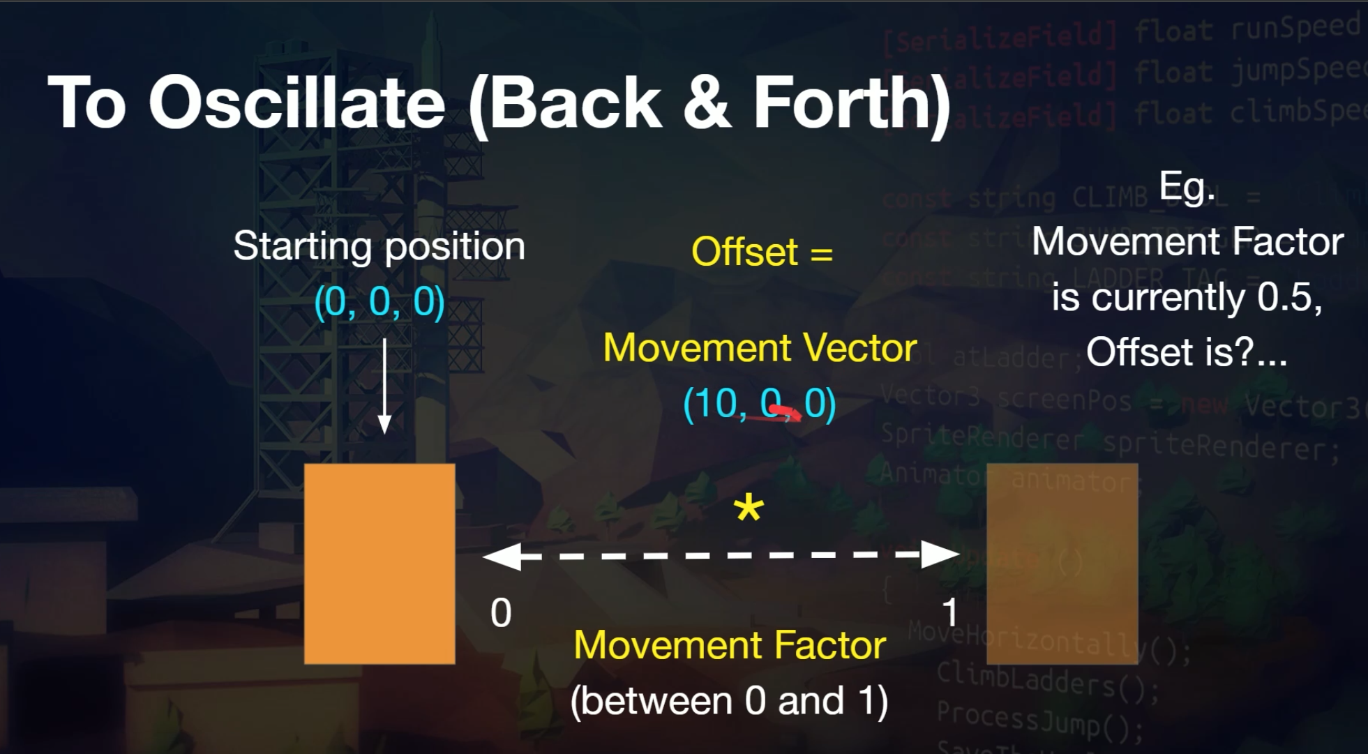 using System;using System.Collections;using System.Collections.Generic;using UnityEngine;public class Oscillator : MonoBehaviour{ Vector3 startingPosition; [SerializeField] Vector3 movementVector; //(10,0,0) float movementFactor; //number between 0 and 1 [SerializeField] float period = 2f; //the point where it repeats itself const float tau = Mathf.PI * 2; //6.28, or one full oscillation void Start() { // startingPosition = GetComponent<Transform>().position; startingPosition = transform.position; } void Update() { // if (period == 0) return; if (period <= Mathf.Epsilon) return; // increases linearly float cycle = Time.time / period; // Sin function expects radians // whatever is outputted by Sin is between -1 and 1 float rawSinWave = Mathf.Sin(cycle * tau); // we get the number of full oscillations // make range be from 0 to 2, then divide by 2 (so the maximum is 1 and minimum is 0) movementFactor = (rawSinWave + 1f) / 2f; Vector3 offset = movementVector * movementFactor; transform.position = startingPosition + offset; }}