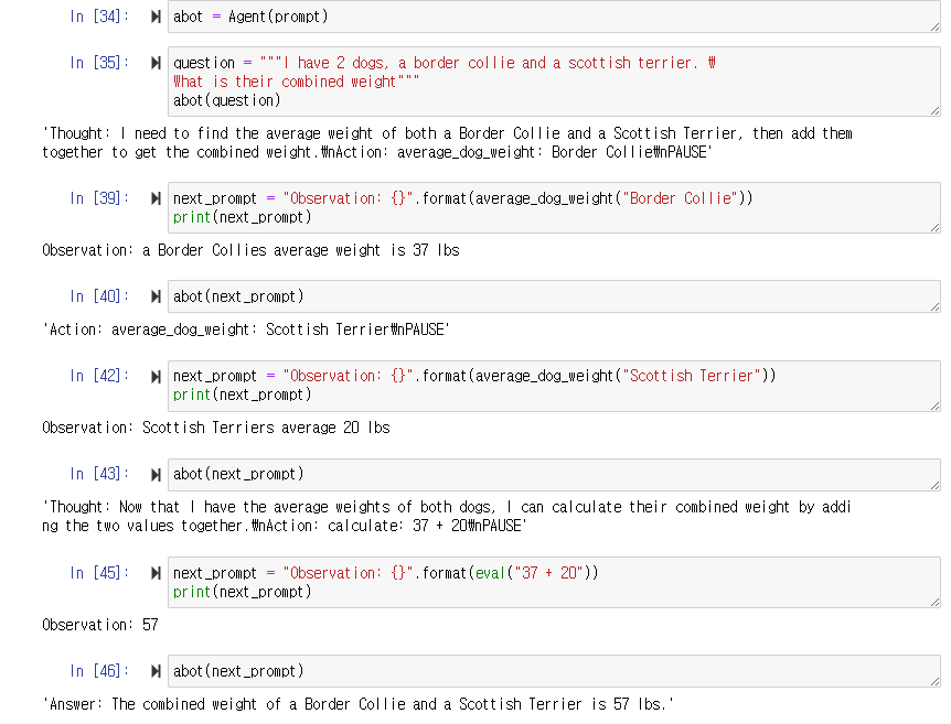 ReAct→Thought,Action,PAUSE,Observation. it can then output an answer only when it finishes that loopThought- describe its thoughts about the question its asked