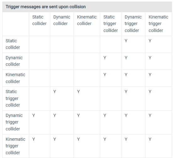 - A static trigger collider collides with any dynamic or Kinematic collider.