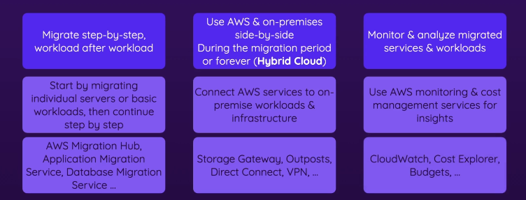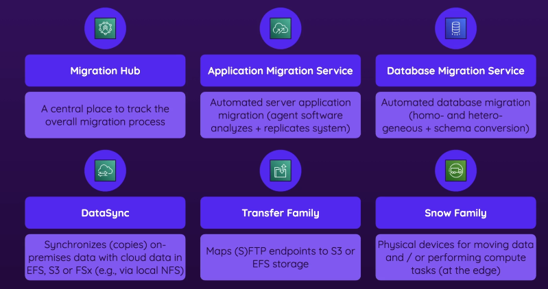 - AWS Migration Hub, Application Migration Service, Database Migration Service, etc