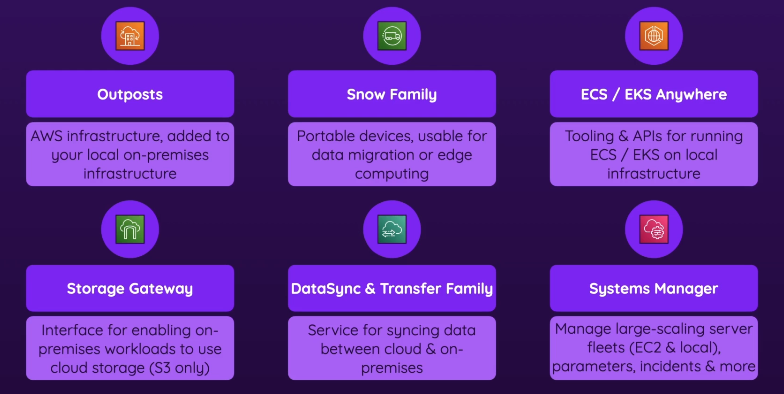 - outposts, snow family, ecs/eks anywhere, storage gateway, DataSync & transfer family, systems manager