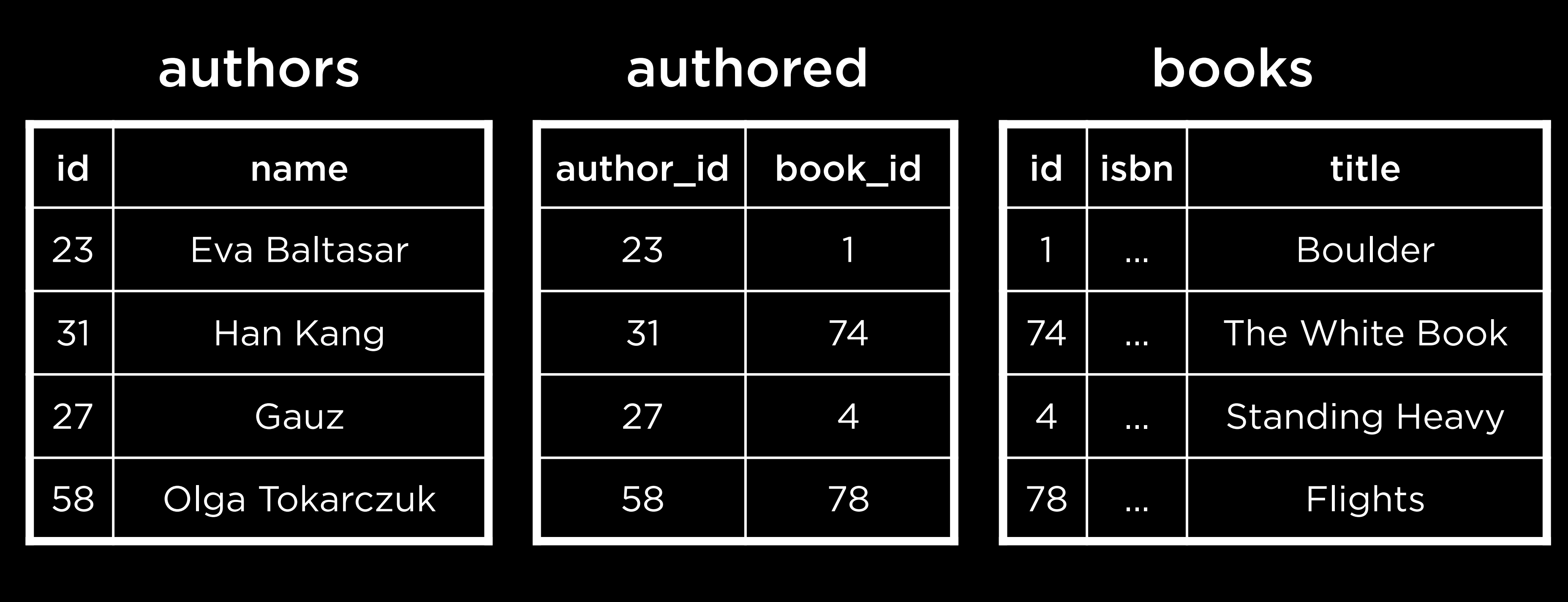 );- The first query that is run is the most deeply nested one — finding the ID of the book Flights. Then, the ID of the author(s) who wrote Flights is found. Last, this is used to retrieve the author name(s).