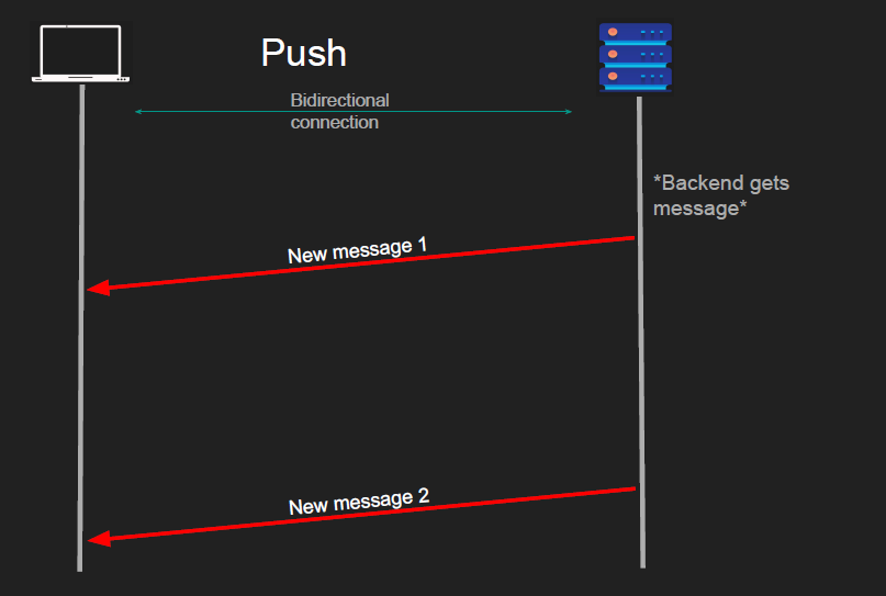 • Message sent to the queue, and it pushes to the clients that are connected to it (consumers)